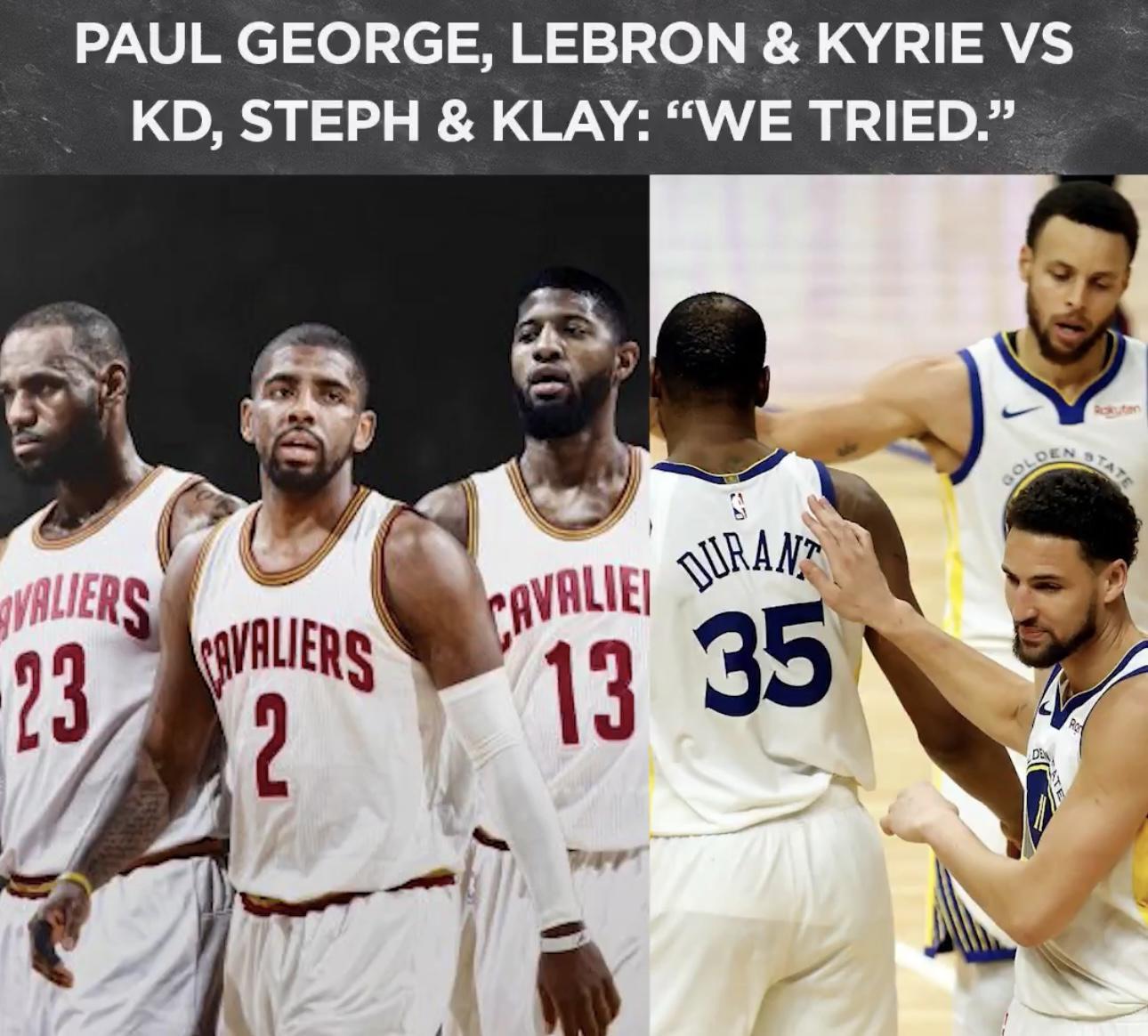 泰伦·卢表示,保罗·乔治在印第安纳时,骑士曾尝试交易得到他,但最终没能成功。对此主持人表示“你们差点就能组成詹姆斯、欧文、乔治的三巨头组合,他们三个都很擅长得分。”泰伦·卢补充道:“别忘了还有乐福,他也很擅长得分。我们真的尝试过。”主持人表示,这样的组合能够对抗勇士的库里、杜兰特和汤普森的组合。