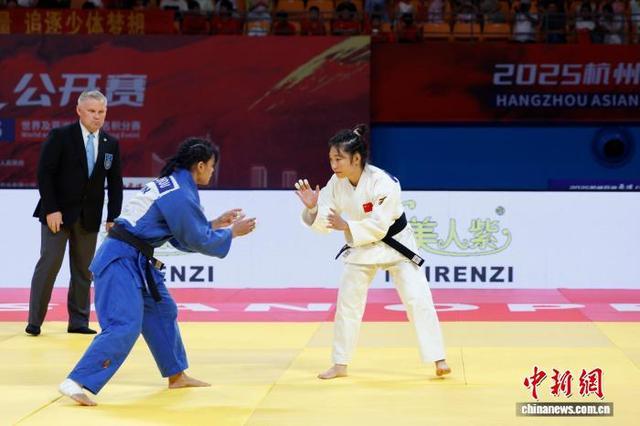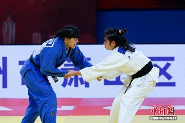 9月6日,2025杭州亚洲柔道公开赛开赛。在女子48公斤级决赛中,中国选手周怡玲(蓝)战胜队友卢雅琴(白),收获赛事首金。图为双方在比赛中。中新社记者 肖健 摄