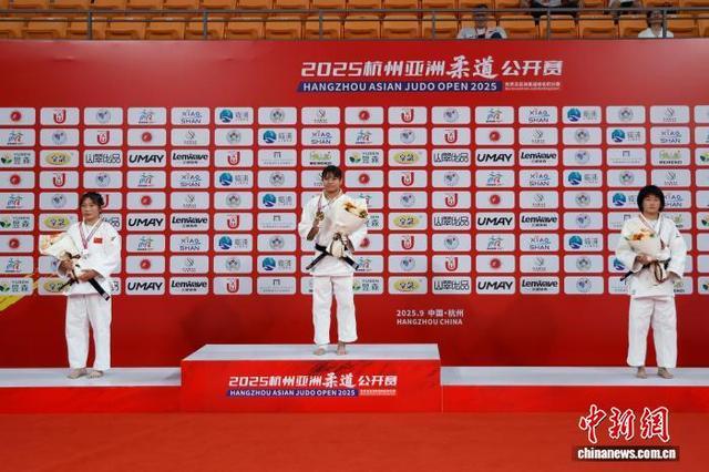 9月6日,2025杭州亚洲柔道公开赛开赛。在女子48公斤级决赛中,中国选手周怡玲战胜队友卢雅琴,收获赛事首金。图为颁奖典礼现场。中新社记者 肖健 摄