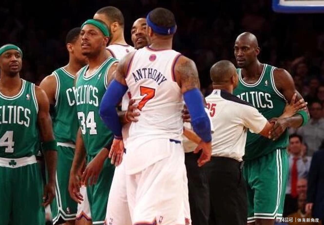 可安东尼哪能咽下这口气,堵在凯尔特人大巴旁边,就等着加内特出来。最后还是在纽约警察、麦迪逊花园主场保安以及当时尼克斯主帅伍德森的“连哄带劝”下,才极不情愿地离开了。那场面,也是一段经典的“垃圾话风云”佳话!
